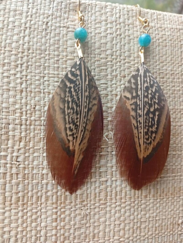 Cette paire de boucles d’oreilles se compose de véritables plumes de faisan aux teintes naturelles, mêlant brun chaud et motifs noirs finement dessinés.