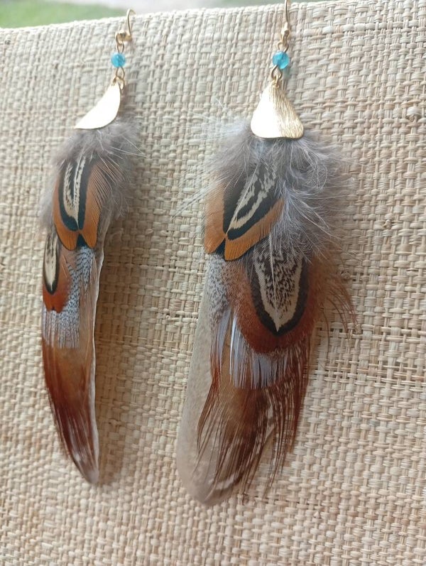 Alliance entre légèreté et énergie minérale, ces boucles d’oreilles associent l’élan sauvage des plumes de faisan à l’éclat bleu profond de l’apatite.